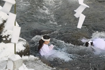 年末大晦日には一年の穢れを祓う、「大祓い修法」がお山にて執り行なわれます。零下10度にもなる厳寒の川の中での10分以上にもわたる命懸けの
