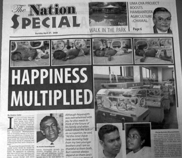 保育器5台を寄贈する式典の日の未明に生まれた4つ子を救うために急遽保育器が必要となり、4つ子が入った状態で保育器が寄贈されたニュースがスリランカの地元新聞やテレビで報道された