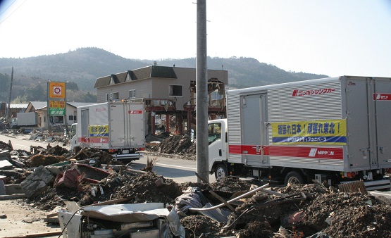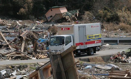 震災後、全国からの支援物資をトラックに積み込み、まだ支援の手が届いていない地域へ向かう